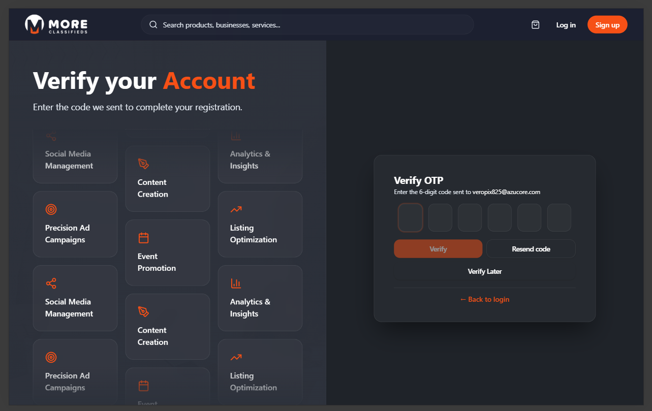 If you did not receive the code, click Resend code after the countdown timer expires. You can also click Verify Later to skip for now — some features will be restricted until your account is verified.