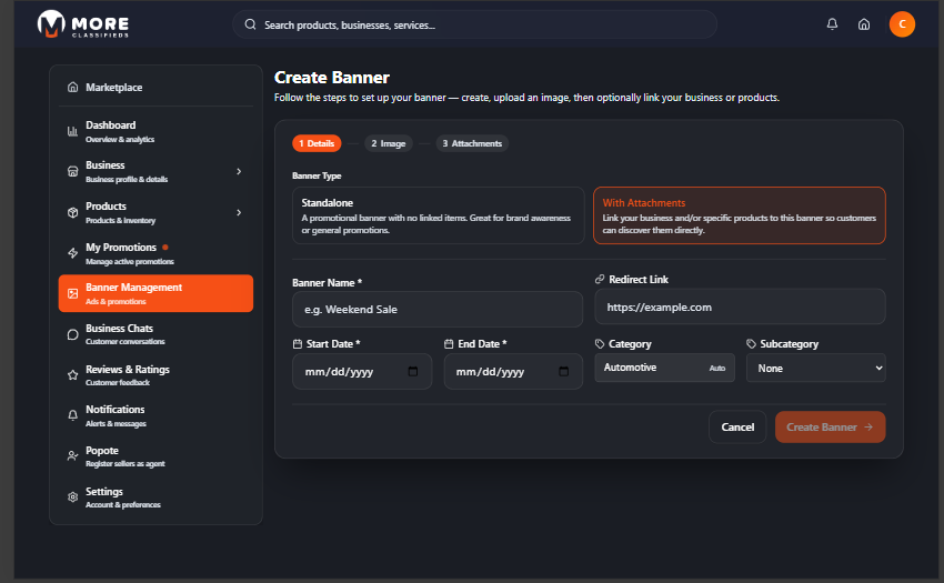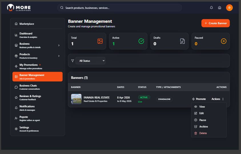 | Banner Management | Create promotional banners that appear on the marketplace |