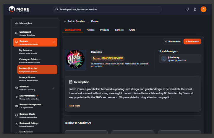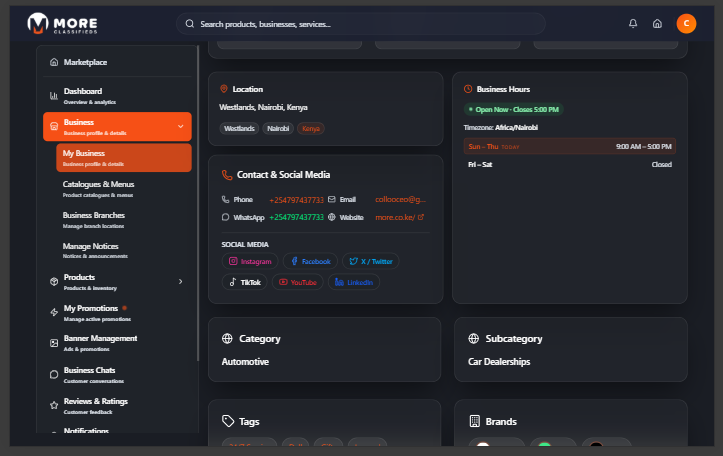 Click Business in the sidebar then select My Business. This is your public-facing storefront on More Classifieds — buyers see this page when they visit your listing. A complete profile builds trust and improves visibility in search results.