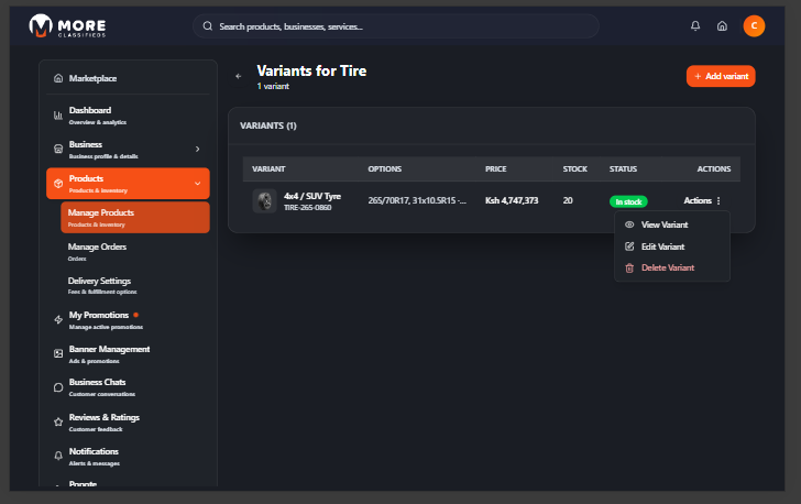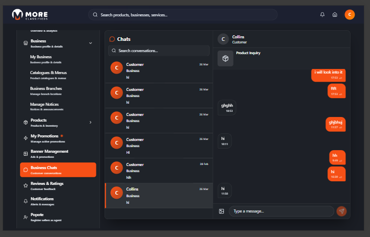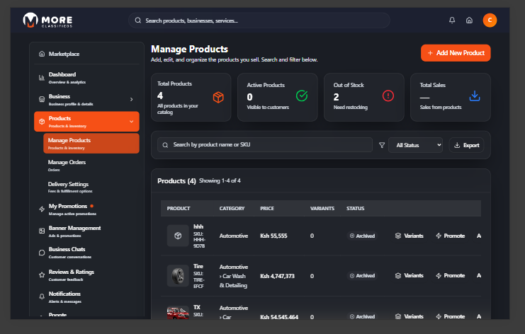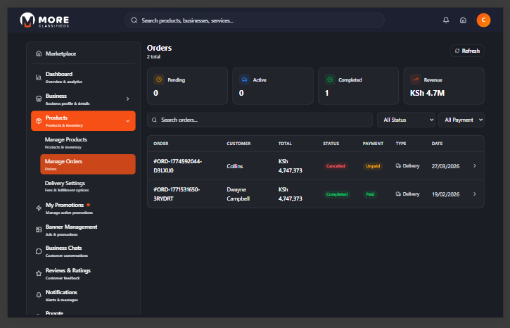 More Classifieds is Kenya's digital marketplace where sellers list businesses, showcase products, receive orders, and connect with buyers nationwide. Whether you run a retail shop, restaurant, service business, or anything in between — More Classifieds gives you the tools to get discovered and sell more.