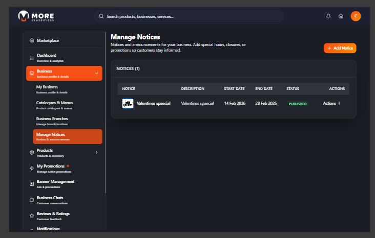 | Manage Notices | Publish announcements visible on your business profile |