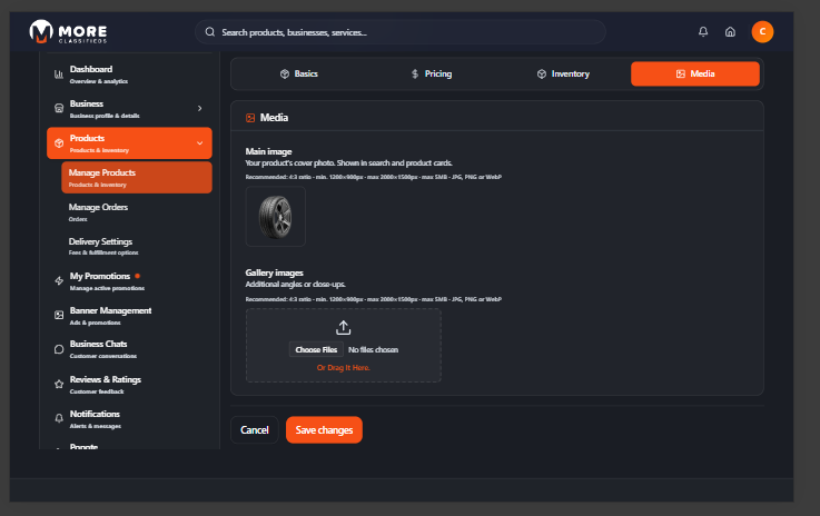 - Main image — The primary thumbnail shown across the marketplace. Recommended: 4:3 ratio, minimum 1200 × 900 px, max 5 MB, JPG / PNG / WebP. Drag and drop or click to browse.
