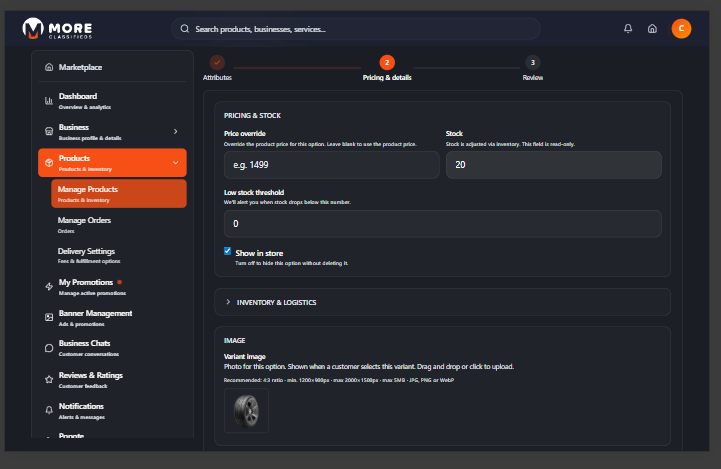- Variant image — Upload a photo specific to this variant (shown when the buyer selects it). Same format requirements as the main product image.