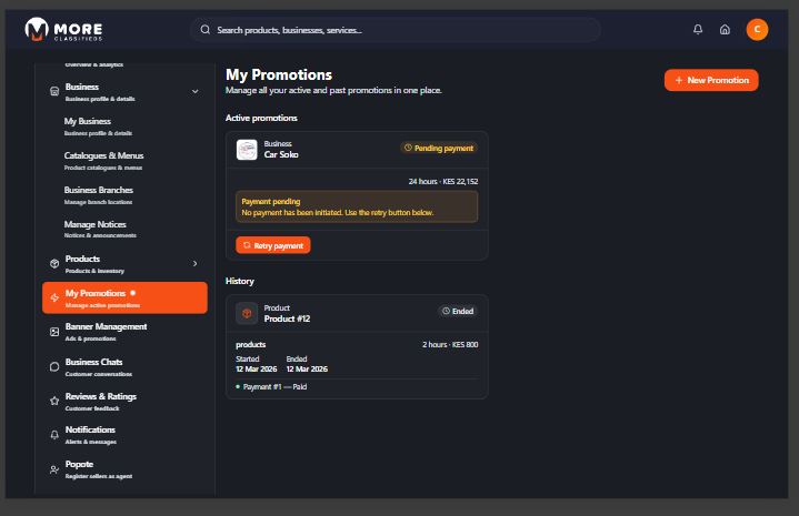 - Pending payment — A promotion was created but payment has not yet been completed. An orange warning is displayed: "No payment has been initiated. Use the retry button below." Click Retry payment to trigger the M-Pesa STK push to your registered phone number.